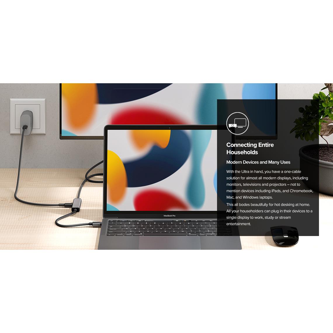The Ultra USB-C to HDMI is a hybrid cable that delivers you double the value. When you need more wherewithal to run an ultra-clear display and fast-charge a port-starved laptop, the Ultra makes it possible to do both. The Ultra’s capacity to support 100W power delivery to laptops connected to HDMI displays makes it peerless too.