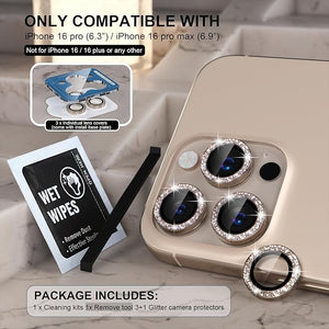 - Bling Camera Lens Protector: We present new upgrade smartphone rear camera lens Protectors which perfectly compatible for iPhone 16 Pro Max 6.9-inch & iPhone 16 Pro 6.3-inch 2024 released. The package contains a set of delicate camera lens protectors, an extra spare lens ring, and a set of cleaning kits. Please confirm the iPhone models carefully before purchase.