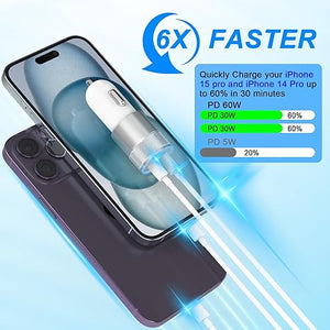 - Equipped with 60W Dual USB-C power output, Our fast car charger can charge two iPhone simultaneously. Provide a maximum of 3.0A/30W when a USB-C PD port is used and 6.0A/60W when dual ports are used simultaneously. Adopt integrated superconductor material which engineered for reduced resistance, boosting charging efficiency and superior temperature control ensureing safer charging and protecting iPhone battery health