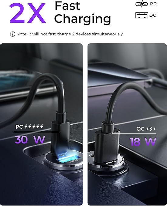 - DUAL FAST CHARGING PORT: LISEN fast charging USB C car charger supporting PD 36W(Max) and QC 18W(Max) high output, can fast charge all prevailing phones and E-devices. This car charger usb c with both of USB-A and USB-C ports can work with all kinds of plugs cables. [NOTE: The fast car charger CANNOT fast charging 2 devices simultaneously.]
