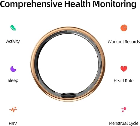 Smart Ring for Women&Men-Activity/Sleep/Heart Rate/HRV/Stress/Women's Health Tracker-IP68 Waterproof/Wearable-No Subscription Fee Required-Compatible with iPhone &Android (Gold, 8)